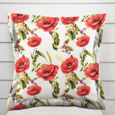 Dekorační povlak na polštář s ozdobným lemem, se vzorem vlčích máků na bílém podkladu. Je ušitý z kvalitní a pevné dekorační látky s digitálním tiskem, se složením z 40% bavlny...