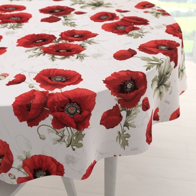 Bavlněný kulatý dekorační ubrus na stůl se vzorem vlčích máků na bílém podkladu. Je ušitý z hustě tkaného 100% bavlněného plátna s certifikátem zdravotní nezávadnosti Oeko-Tex...