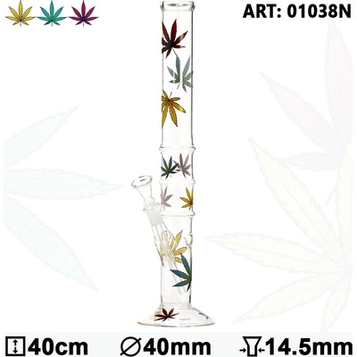 Základní bong rovného tvaru s nápaditým potiskem barevných listů marihuany. Bong je vysoký optimálních 40 cm a průměr hubice je také 40 mm. U skleněného bongu najdete skleněný...