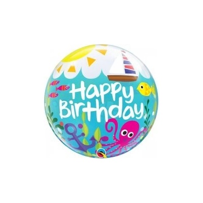 Bublina s motivem moře a nápisem Happy Birthday. Přibližná doba vznášení po naplnění heliem je 30 dní. Objem činí 27-40l, průměr je 56cm. Skutečná doba vznášení a objem balónku...