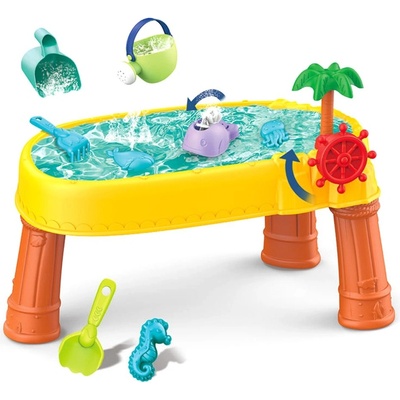 Vodní stůl ve tvaru pirátské lodi má odolnou plastovou konstrukci a spoustu chytrých prvků, které pošťouchnou dětskou fantazii k pořádnému dobrodružství. Uprostřed trůní stožár – vodní fontána, co chrlí vodu. Děti vodu ve fontáně rozpohybují pomocí pumpy nebo naléváním...