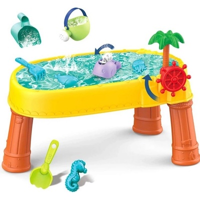 Stolek pirátská loď je ideální hračka pro hru s vodou a pískem. Sada obsahuje 8 doplňků : 3 formičky, rybičku, konev, nádobu s rukojetí, hrábě a lopatku. Stůl má volant, kterým můžete otáčet a cítit se jako skutečný pirát. Sada je určena pro vnitřní i venkovní hraní....