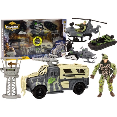 Vojenská sada se světelnými a zvukovými efekty. Obsahuje vojenské vozidlo nebo helikoptéru, postavičku vojáka a další příslušenství. Baterie: 2xAG13 (součástí výrobku) Vojenská...