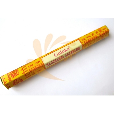 Indické vonné tyčinky od výrobce Goloka, vyrobené ze směsi bylin, medu, pryskyřic a olejů. Nag Champa – vonná směs indického původu, jejíž součástí je květ champa ze stromu...