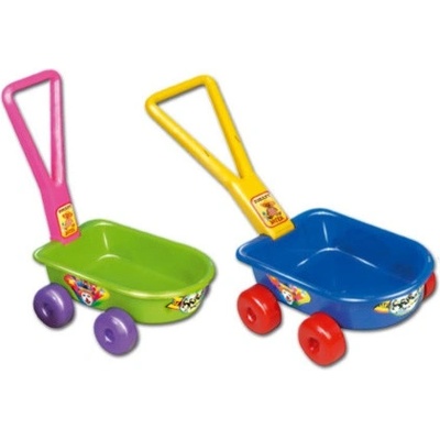 Dětský barevný vozík vyrobený z kvalitního plastového materiálu se čtyřmi kolečky a pohyblivou rukojetí. Na vozíku jsou také veselé obrázky. Rozměry: 43x27 cm. Určeno pro děti od 36 měsíců. Barva - červená.
