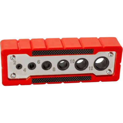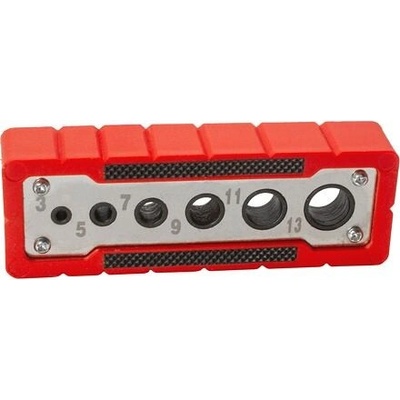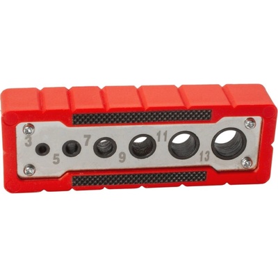 Praktický vodicí přípravek pro vrtání v různých průměrech (4–12 mm). Pogumovaný povrch pro pevný úchop a přilnutí k obrobku. Boční drážky označují středy předznačených vrtacích...
