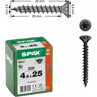 Univerzální pozinkovaný šroub, černý BLAX Číslo výrobku: 1191040450253 EAN: 4003530275791 Délka závitu: 20 mm Velikost bitu: T20 Průměr hlavy: 8.8 mm Celková délka: 25...