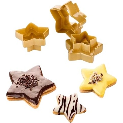 Stylová sada 3 zlatých vykrajovátek ve tvaru hvězdy z řady DELÍCIA od TESCOMY. Oboustranný design nabízí hladké i vroubkované okraje pro kreativní pečení cukroví, perníčků i...