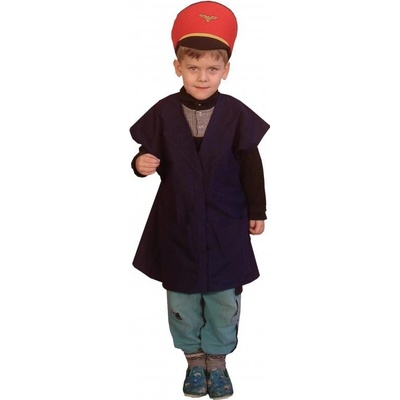 Výpravčí - kostým (sako, čepice) je vyroben ze 100% bavlněné látky. Lze prát při teplotě do 30°C. Vhodné pro děti předškolního věku.Velikost: 3 - 6 let
