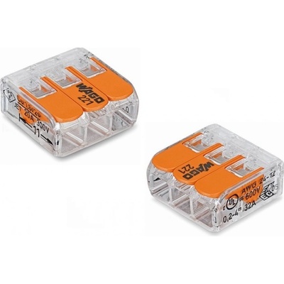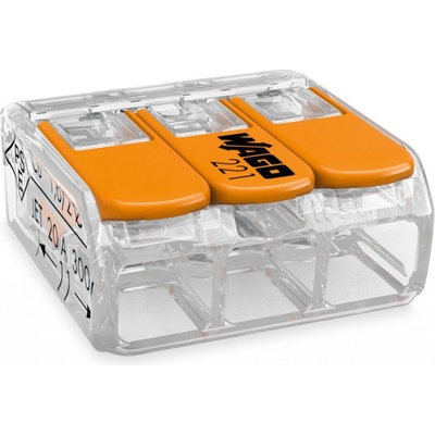 Svorka WAGO 221-413 s páčkou, pro průřez vodičů 3x0,14-4(4) mm, 3pólová. Slouží pro spojení dvou vodičů.