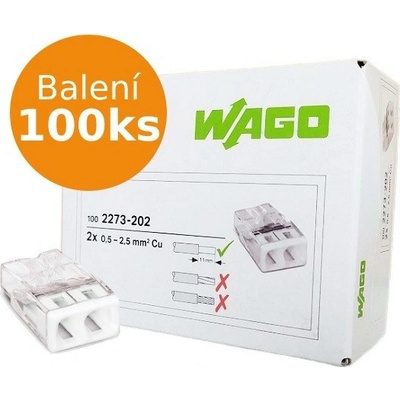 WAGO svorky balení 100ks typ 2273-202 MINI za zvýhodněnou cenu. WAGO svorka průhledná je určená pro připojení vodičů o průřezu 0.5 - 2,5 mm² jako bezšroubové spojení vodiče. Průhled v krytu slouží pro kontrolu izolace s testovacím otvorem pro všechny běžné zkoušečky.