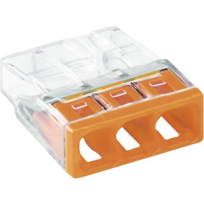 Spojovací krabicová svorka. Technické parametry: Počet pólů: 3 Průřez: 0,5 - 2,5 mm2 Druh spoje: PUSH WIRE® Počet žil: 3 Přípustné napětí: 450 V Přípustné impulzní napětí: 4 kV Proud: 24 A Barva: transparentní/oranžové Způsob připojení: boční Rozměry: 5,8 x 14 x 16,7...