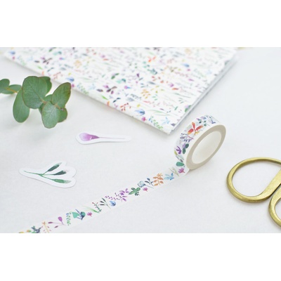 Washi páska s autorkými ilustracemi - Ilustrovaná páska vyrobená z washi papíru - Bílé pozadí s akvarelovým motivem - Poloprůhledný efekt, lze odlepit a opětovně...
