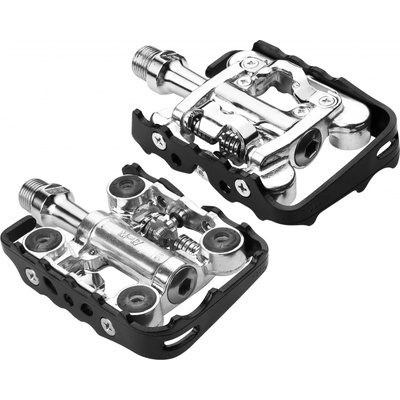 Víceúčelové pedály kombinující SPD systém a klasický pedály Tělo pedálů Alu / Alu klec Osa Cr-Mo Uložení osy průmyslové ložisko + polymerové uložení Rozměr 100,8 x65,2 x 27,2mm Hmotnost 346g bez záražek