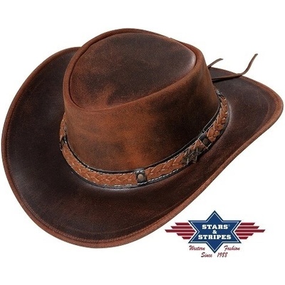 Nádherný westernový klobouk vyrobený z voskované štípané kůže v červenohnědém odstínu. Precizně zpracovaný ozdobný pásek je také z koženého materiálu. Pletený pásek je zdobený conchou s logem Stars & Stripes. Vnitřní strana klobouku je opatřena měkkým polstrováním pro...