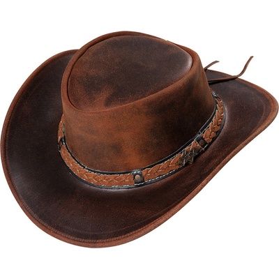 Stylový kožený westernový klobouk z červenohnědé broušené kůže je ozdoben koženým pleteným řemínkem s nýty, pohodlné nošení zajišťuje měkký elastický pásek uvnitř po obvodu klobouku. Materiál: 100% kvalitní hovězí kůže Barva: hnědá Velikosti: S, M, L, XL