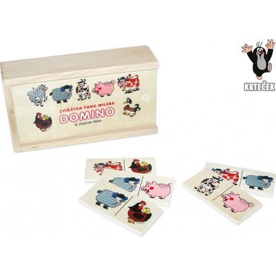 Domino dřevěné Krtek. S motivy zvířátek pana Milera. Rozměry dřevěné krabičky 16x9,2x4,5 cm. Návod součástí.