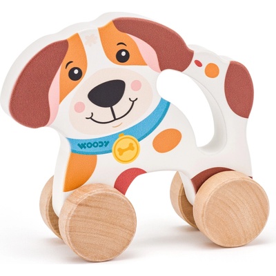 Dřevěná hračka pro nejmenší, pejsek na kolečkách, psík s držadlem, jehož tvar umožňuje dětské ručce pohodlný a pevný úchop. Design české návrhářky. Česká značka WOODY - to...