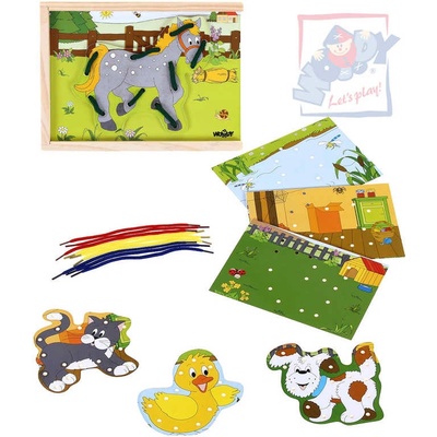 Dřevěné veselé prošívací obrázky zvířátek ze dřeva, vhodné pro nejmenší děti, v krabičce. Kočička, koníček, pejsek, káčátko. Dítě přišívá tkanicí obrázek na podložku....