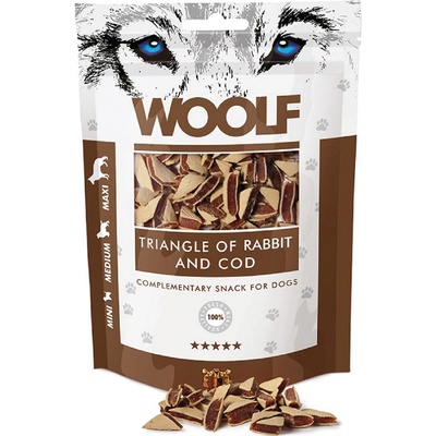 WOOLF Triangle of Rabbit and Cod 100g Pamlsky pro psy Specifikace produktu - měkké pochoutky pro psy všech velikostí a věku - z králičího masa a tresky - ze 100 % použity bílkoviny té nejvyšší kvality - skvělé jako odměna při výcviku nebo svačina na cestách -...