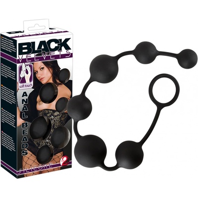 Chain »Anal Beads« - šest černých kuliček na řetězci z hebkého silikonu. Všechny korálky mají jinou velikost od 2,3 do3,9 cm. Lehce flexibilní s očkem na konci. Celková délka cca. 40 cm. Materiál: silikon. Značka Black Velvets.