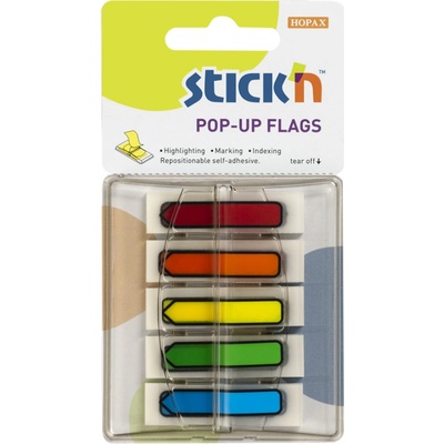 Záložky z PP tloušťky 60 mic. bez dispenzoru, opakovaně použitelné, ultra tenké a popisovatelné. Rozměry 12 × 45 mm. Dodáváno v mixu 5 barev po 25 lístků.