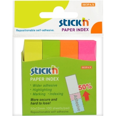 Samolepicí záložky | 50x12 mm | Stick'n by Hopax 21613 ️ Praktické samolepicí papírové záložky Stick’n by Hopax 21613 ve čtyřech neonových barvách (oranžová, růžová, zelená,...