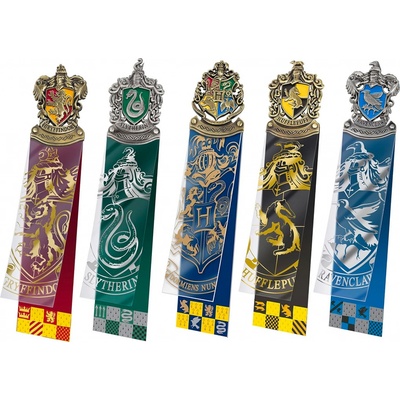 Set 5 záložek s erby Bradavic a bradavických kolejí. Rozměry: 25 x 23 cm