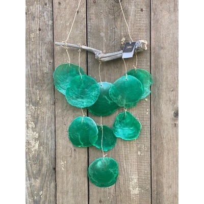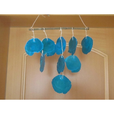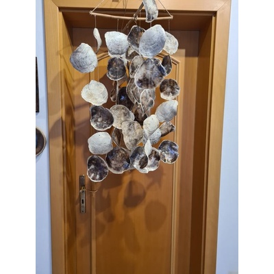 Na silném vlasci a bambusovém základu navlečené mušle vytvářejí závěsnou kompozici, která ve větru zvoní.