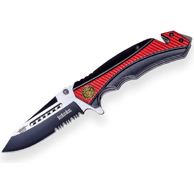 Zavírací záchranářský nůž Albainox 19431+GR203, červenočerné barevné provedení, obrázek hasičského vozu na rukojeti, pojistka linerlock, nylonové pouzdro.