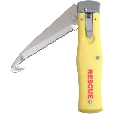 Záchranářský nůž ESP s vroubkovaným ostřím - žlutý. Záchranářský nůž ESP spojující v sobě funkce hned několika nástrojů - nože, řezače na textilní pouta a hrotu na rozbíjení skla.
