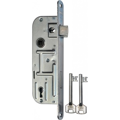 Zámek vložkový s převodem určený pro jedno a dvojkřídlé dveře pravé či levé. Vzdálenost mezi otvorem pro kličku a otvorem pro vložku je 90 mm, hloubka pro zadlabání je 80 mm....