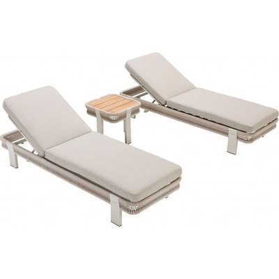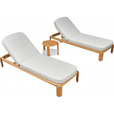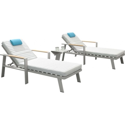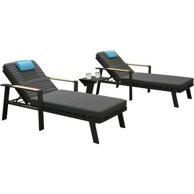 Pohodlný venkovní odpočinek s nastavitelnými lehátky a praktickým stolkem — relaxujte bez starostí.