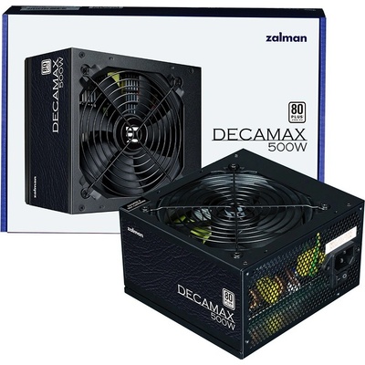 ZALMAN Decamax 500 W; Napájecí zdroj o výkonu 500 W osazený tichým 120 mm velkým ventilátorem. Účinnost zdroje splňuje certifikaci 80PLUS Standard. ZÁKLADNÍ SPECIFIKACE; Výkon: 500 W; Velikost ventilátoru: 120 mm; Certifikace: 80PLUS Standard; Napájec...