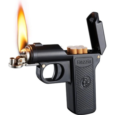 Benzínový zapalovač ve tvaru pistole, s kamínkovým zapalováním. V horní části zapalovače je pouzdro pro 6 cigaret. Při prvním stisknutí spouště se otevře zásobník cigaret, při...