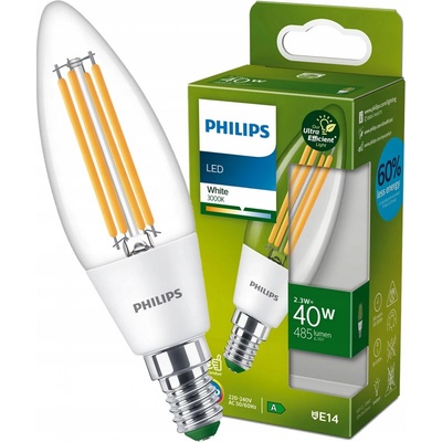 LED žárovka E14 B35 2.3W = 40W 485lm 3000K Filament Ultra PHILIPS LED žárovka s paticí E14 od společnosti PHILIPS je ideální náhradou za tradiční žárovky. Ve srovnání s...