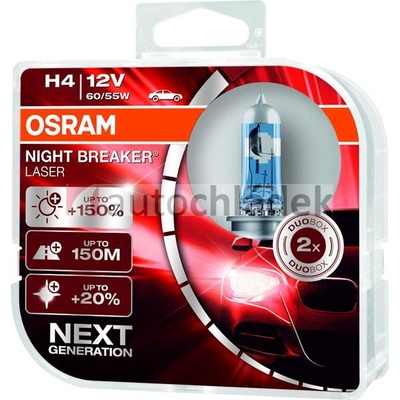 OSRAM Žárovka H4 12V 60/55W P43t NBL NEXT GENERATION +150% 2ks OSRAM Žárovka H4 12V 60/55W P43t NBL NEXT GENERATION +150% Obsah balení: 2 ks Použití: žárovky pro reflektory Vlastnost: vyšší svítivost Nová generace Night Breaker Laser má nový tvar „okna“ v povrstvení....