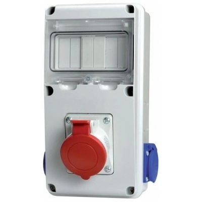 Zásuvková rozvodnice nejištěná, osazená zásuvkami, s prostorem pro jištění řady ENERBOX 3x zásuvka. Osazení zásuvek: 1x 400V/16A/4p, 2x 230V/16A