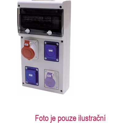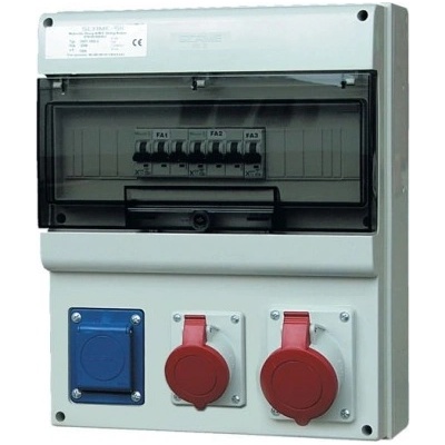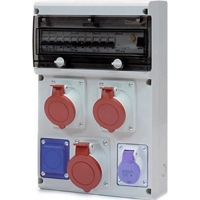 Zásuvková rozvodnice osazená jističi, proudovým chráničem a elektroměrem řady D431. Zásuvka 1x 230V/16A, 1x 400V/16A, 1x 400V/32A, jištění: 1xB16/1,1xC16/3,1xC25/3+FI-40A,...