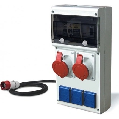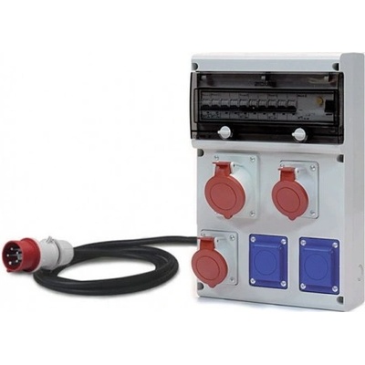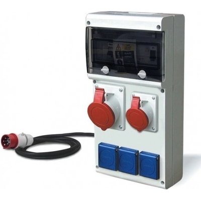 Zásuvková rozvodnice s kabelm a vidlicí osazená jističi, proudovým chráničem a elektroměrem řady 632 5x zásuvka. Zásuvka 1x 400V/32A, 2x 400V/16A, 2x 230V/16A, jištění: 1xC16/3,...