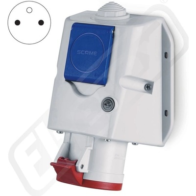 Zásuvka nástěnná s vypínačem řady OPTIMA, v šikmém boxu. Osazená průmyslová zásuvka CEE 3P+N+E (pětipólová), 16A, 6h/380-400V, 50/60 Hz, krytí IP54.