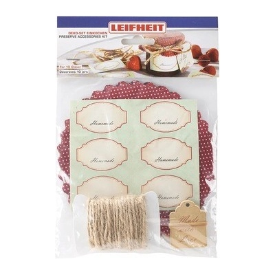 Dekorační set na zavařování značky Leifheit. - set pro dekoraci deseti sklenic: samolepící etikety, bavlněné deko ubrousky, gumové těsnění, ozdobné provázky z...