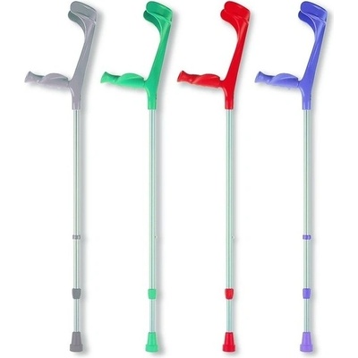 Francouzská berle s vyměkčeným anatomickým držadlem, s barevnou duralovou trubkou a barevnou plastovou opěrkou předloktí.