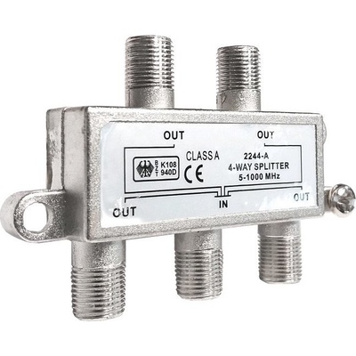 Pasivní čtyřcestný anténní rozbočovač třídy CLASS A (2242-A) 5 - 1000 MHz. Parametry: oddělovací útlum 500 MHz: 25 dB průchozí útlum 500 MHz: 7 dB útlum odrazu 500 MHz: 20...