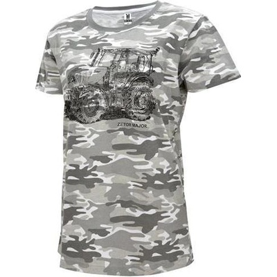 Tričko Zetor unisex Major Unisex tričko s krátkým rukávem a potiskem traktoru Major na hrudi. Barva: šedo-bílá, kamufláž Materiál: 85% bavlna a 15% viskóza k dodání ve...