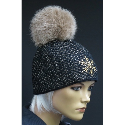 Luxusní zimní čepice s metalickým efektem lurexu je zdobená motivem ve tvaru vločky a naší krásnou kožešinovou bambulí Špongr. Kompletně český výrobek! - kožešinová bambule z...