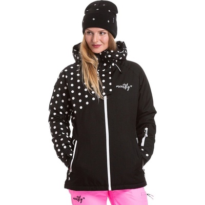 Snowboardová dámská zimní bunda Meatfly Deborah black dots, 100% polyester. Vodní sloupec 15.000mm, prodyšnost 10.000g. Kapuce a spodní lem bundy je možné stáhnout na gumku....