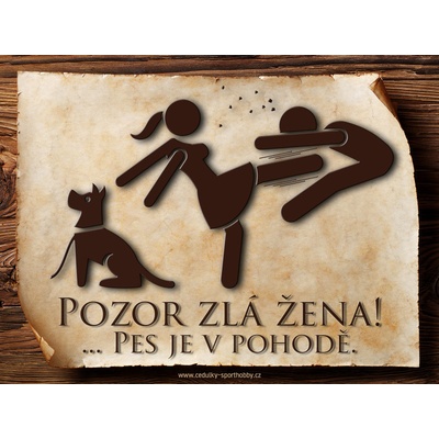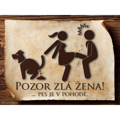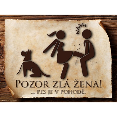 Vtipná cedulka s nápisem "Pozor zlá žena ..." v.6 ve slovenském jazyce. Velikosti těchto cedulek jsou 15x11,25 a 20x15 a 26,7x20 cm. Cedulky jsou tištěny sublimační technologií...