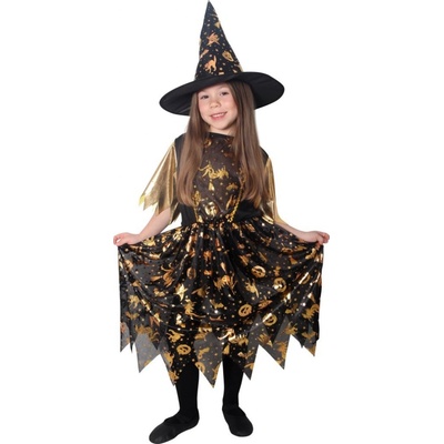 Halloweenský kostým pro malé čarodějnice! Kostým černo-zlaté barvy ve velikosti S je určen pro holčičky ve věkovém rozmezí 4-6 let (105-116 cm). Šaty jsou dekorovány zlatými...