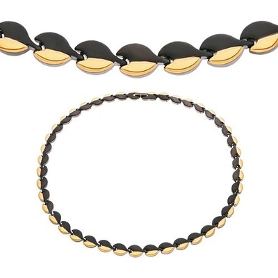 Náhrdelník z oceli 316L, články ve tvaru lístků v černozlaté barevné kombinaci, magnety a glazované kuličky.